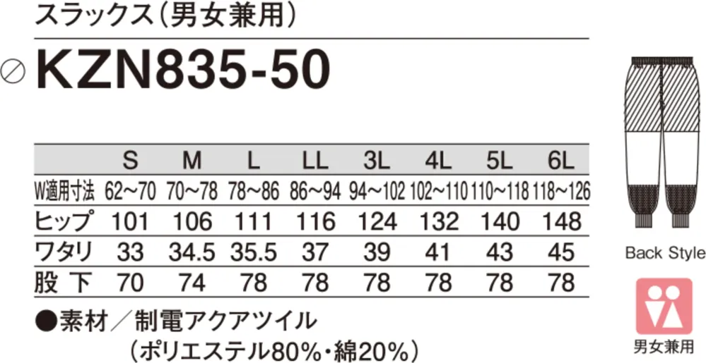 食品白衣jp 食品工場用 パンツ(米式パンツ)スラックス KAZEN KZN835-50 スラックス(男女兼用)※掲載価格は変更される場合がございます。