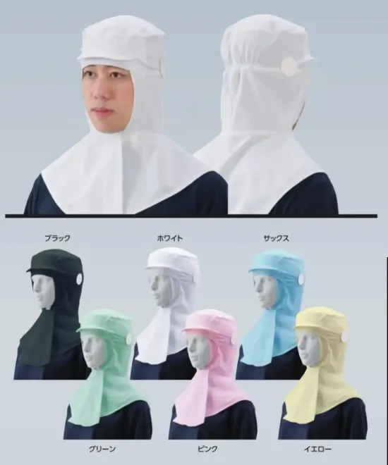 ・ストレッチ性と耐久性を兼ね備えたコアソフト素材を使用・フルダル素材採用で淡色でも透けにくい・ソフトな肌触りで長時間着用時の不快感を軽減・前開き仕様で着脱がしやすく作業効率が向上・頭部保護具が収まる設計(Sサイズは非対応)で作業性に配慮・頭部保護具ポケット付きで安定した装着が可能・美額フライスを顔まわりに使用し、洗濯後もフィット感が持続・後頭部ゴム仕様で頭部にしっかりフィット・メガネホルダー付きで隙間からも毛髪落下を軽減・マスクホルダー合皮仕様で耳への負担を軽減・膨らんだ形状の長髪対応設計でまとめた髪をしっかり収納・首元スナップボタン付きで首元サイズの調整が可能・6色展開で作業環境や用途に合わせて選択可能
