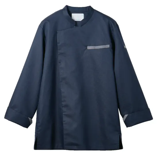ヨーロッパテイストをベースに、機能性とファッション性を高めたコックコート。低めのスタンドカラーと配色デザインが洗練された印象を与え、見られる現場にふさわしい一着。