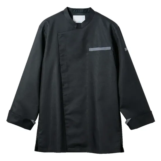 ヨーロッパテイストをベースに、機能性とファッション性を高めたコックコート。低めのスタンドカラーと配色デザインが洗練された印象を与え、見られる現場にふさわしい一着。